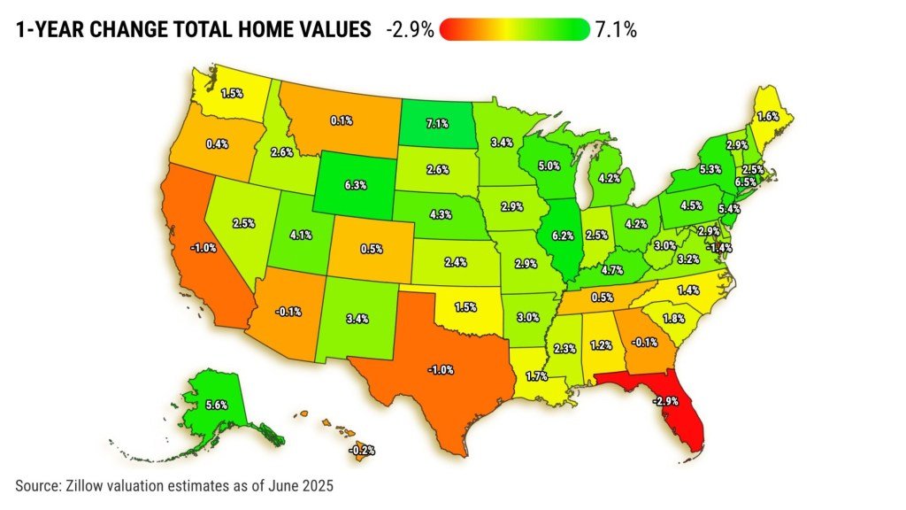 My trusty spreadsheet peeked at a Zillow report tracking total home values for the year ending in June and the pandemic era — February 2020 through June 2025. Zillow totaled all of its price estimates for every state and the nation. Mortgage liabilities were not deducted from those valuations.