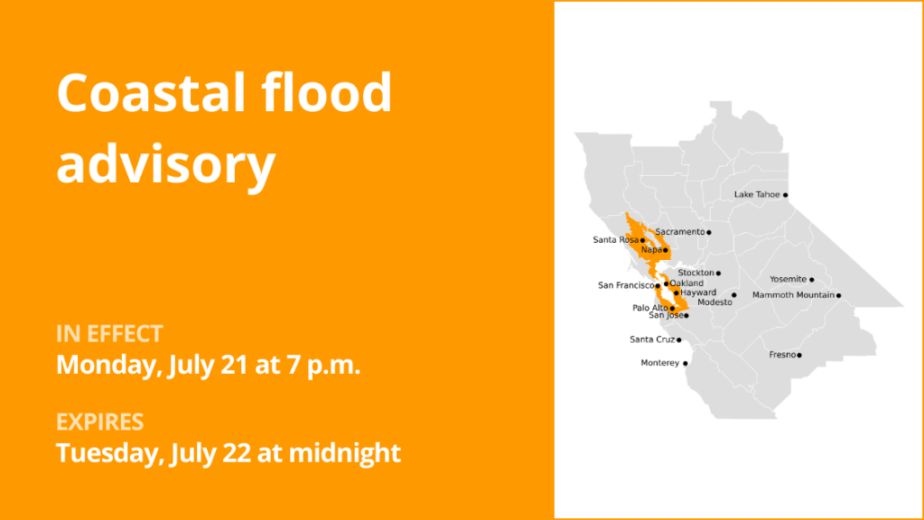 North Bay Interior Valleys and San Francisco Bay Shoreline as well as San Francisco County are the focus of an updated coastal flood advisory released at 7:39 p.m. on Tuesday by the National Weather Service. The advisory is valid from 8 p.m. until Wednesday July 23, at 1 a.m.