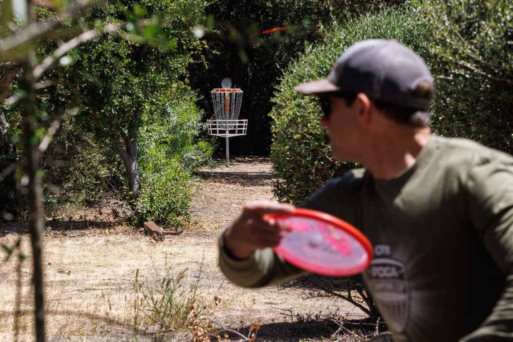 “Has anyone seen my red disc?” Savella asks as he disappears behind a shrub. Upon retrieving it, the Burlingame resident then plants himself among the plants, searches for the basket again and takes aim.