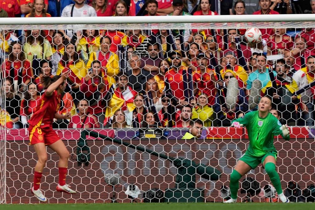 Spain took the lead Sunday with a very English goal – a full back’s cross from the byline finding the head of an Arsenal player to score, on a rain-slicked field on an overcast, cloudy day.
