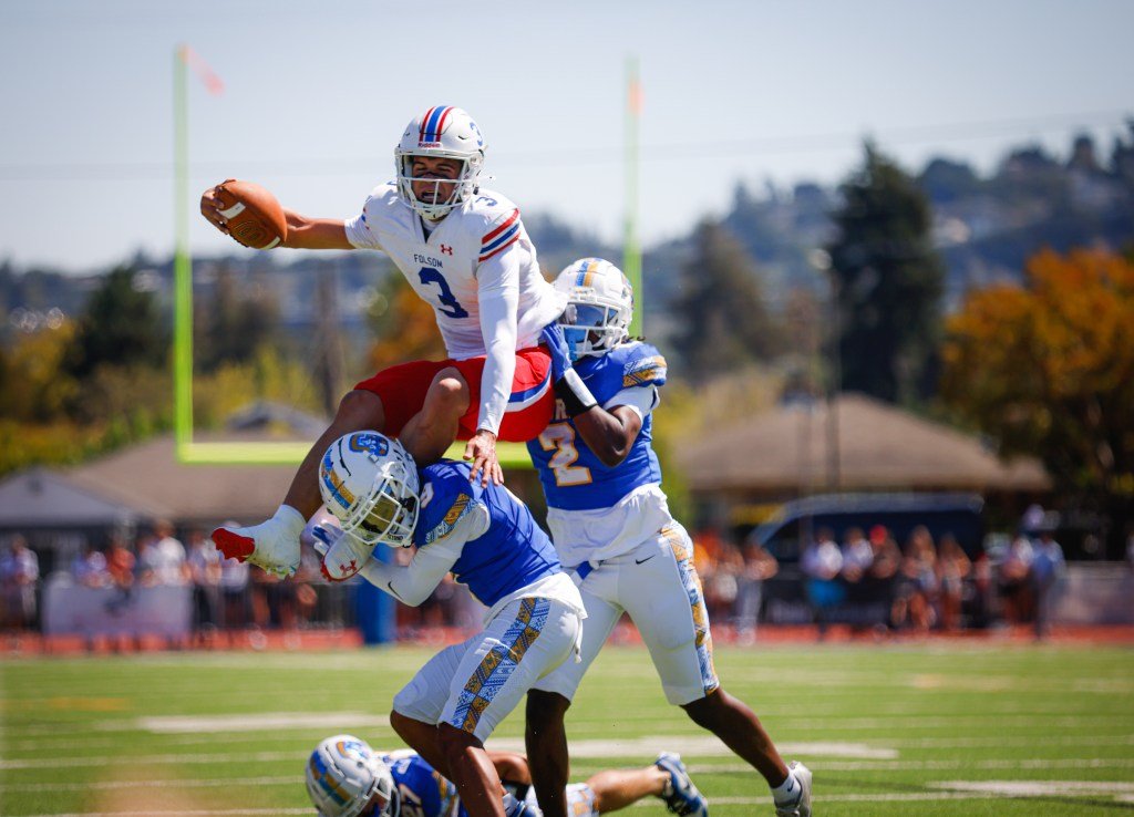 Folsom's Ryder Lyons (3) jumps over Serra's Aidan Labrador (9) and Serra's Aaron Maier (2) in the first quarter at Serra High School in San Mateo, Calif., on Saturday, Aug. 30, 2025. (Shae Hammond/Bay Area News Group)