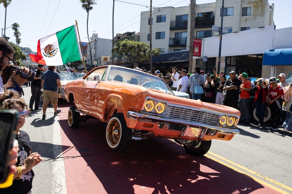 Participants cruise down Mission Street during the Lowrider Parade in San Francisco, Calif., on Saturday, Sept. 20, 2025. For the first time, the lowrider parade was televised as part of the National Hispanic-Latino Heritage Month. (Joyce Xi for the Bay Area News Group)