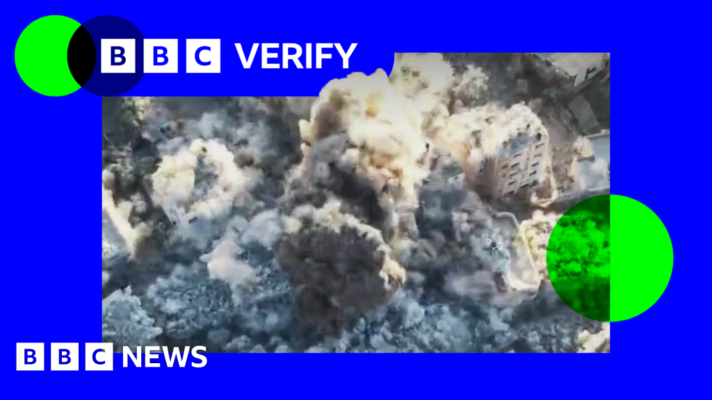 BBC A screengrab from a video showing the demolition of a building in Gaza City. Smoke is seen erupting from several buildings as explosives are detonated. The image is imposed over the BBC Verify colours and branding. BBC