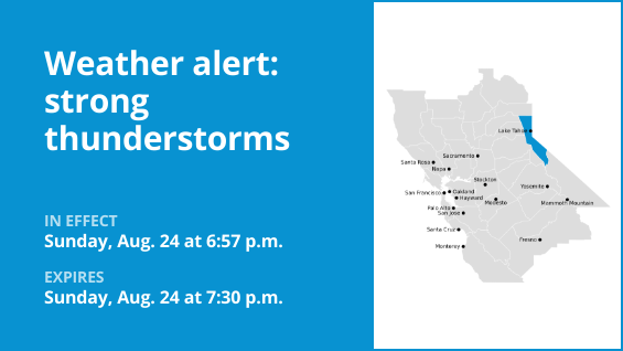 The National Weather Service issued a weather alert at 6:57 p.m. on Sunday for strong thunderstorms in effect until 7:30 p.m. for the Greater Lake Tahoe Area.