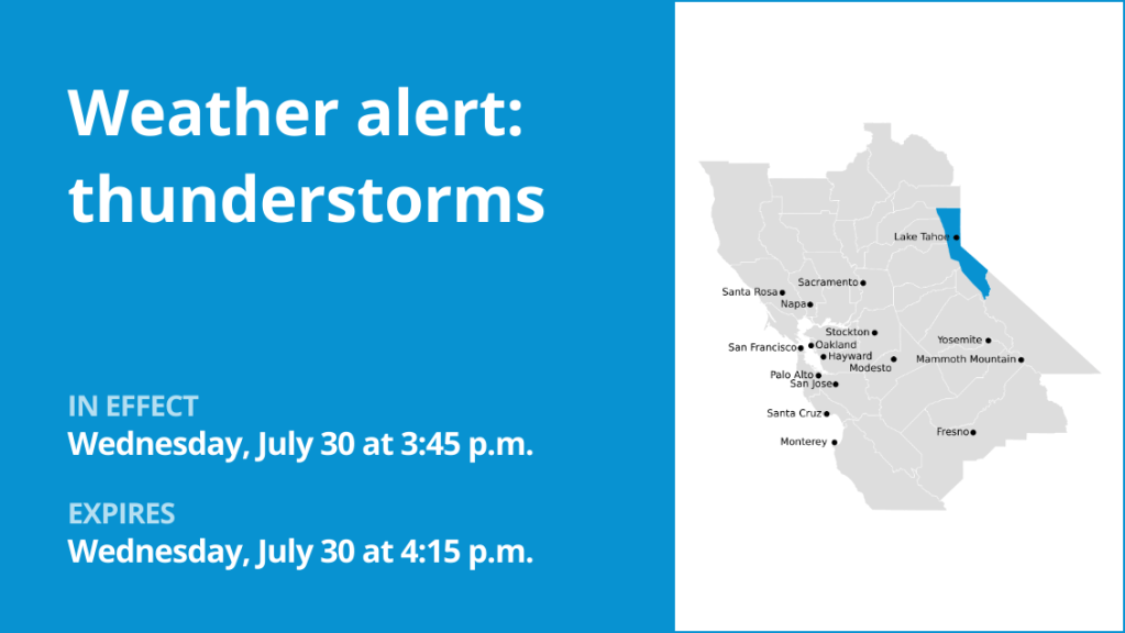 A report from the National Weather Service was issued on Wednesday at 3:45 p.m. for thunderstorms and outflow in effect until 4:15 p.m. for the Greater Lake Tahoe Area.