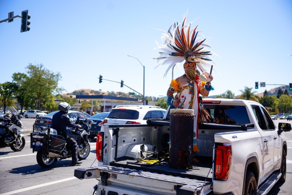 Under the hot afternoon sun, a cadre of Aztec dancers stomped and swayed to the relentless tattoo of drums, the foot-long feathers of their crowns bouncing to the rhythm as they led the marchers on a mile-and-a-half trek through Morgan Hill’s main thoroughfare. Onlookers watched the crowd move through the streets, waving from balconies or shooting video from their cars and porches.