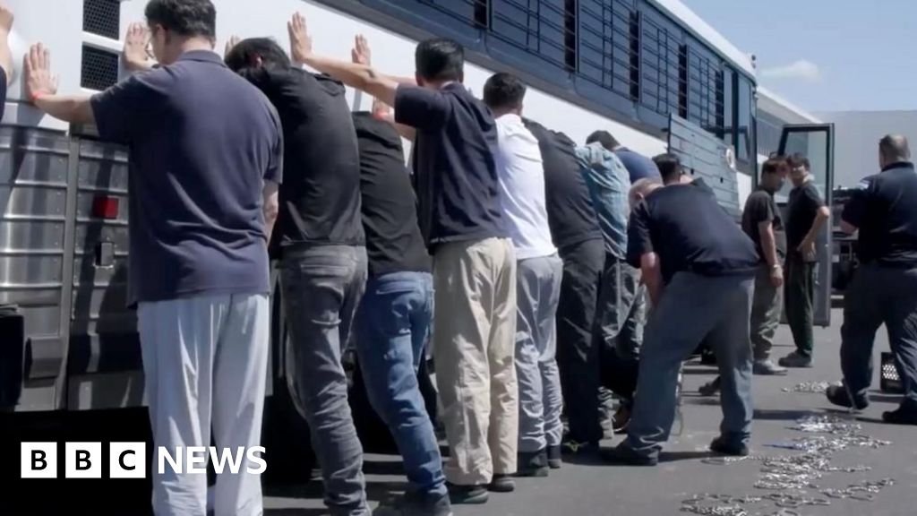 ICE has released footage of the raid showing federal agents arriving in armoured vehicles and lining up workers outside the factory, with some shown chained together before being loaded onto coaches.