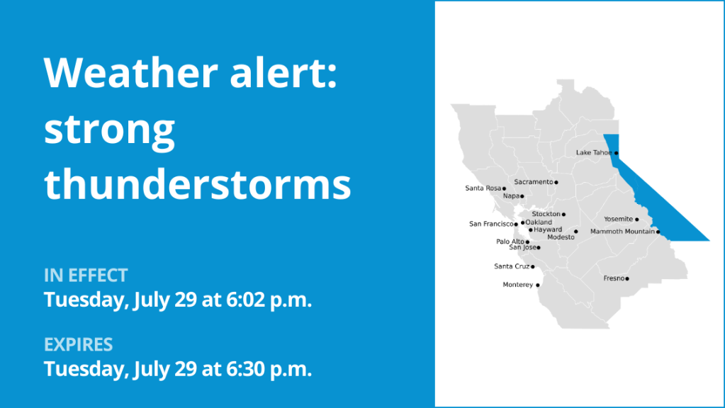 The Greater Lake Tahoe Area, the Mammoth Mountain Area, Mineral and Southern Lyon counties and Greater Reno-Carson City-Minden area are the focus of a weather alert for strong thunderstorms issued at 6:02 p.m. on Tuesday by the National Weather Service. The alert is in effect until 6:30 p.m.