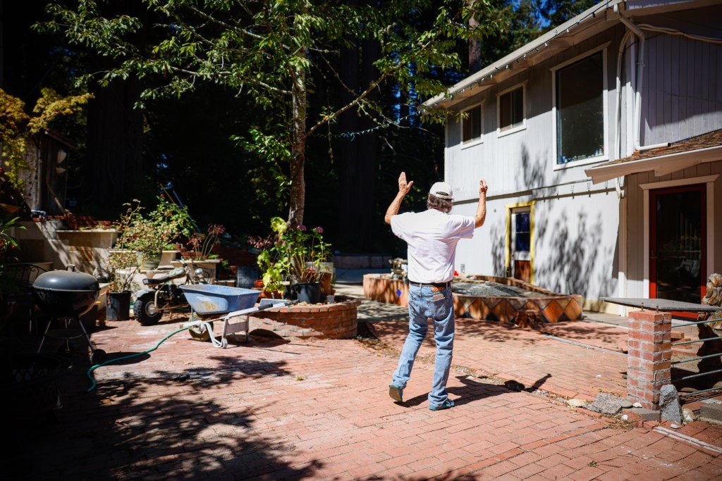 Rick Parfitt, a member of the Santa Cruz County FireSafe Council, stands on concrete steps that he made at his home in Los Gatos. Parfitt has done significant work clearing flammable materials from five feet around his home. (Shae Hammond/Bay Area News Group)