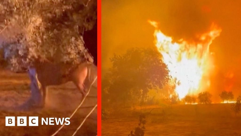 Locals tried to put out a wildfire threatening a yard of horses on Chios in Greece.